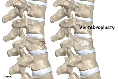 The patient is treated with local anesthesia and light sedation, usually in an x-ray suite or operating room on an outpatient basis. A biopsy needle is guided into the fractured vertebra under X-ray guidance through a small puncture in the patient's skin. Specially formulated acrylic bone cement is injected under pressure directly into the fractured vertebra, filling the spaces within the bone - with the goal of creating a type of internal cast (a cast within the vertebra) to stabilize the vertebral bone. The needle is removed and the cement hardens quickly (about 10 minutes), congealing the fragments of the fractured vertebra and stabilizing the bone. The small skin puncture is covered with a bandage Shortly after the cement has hardened, the patient is free to leave the medical facility and can go home the same day. Patients are usually advised not to drive themselves home the day of the procedure, and may need to spend the night at a hotel in the area if they have to travel a long distance. If the patient needs further observation after the procedure, is particularly frail, or will not have assistance at home, a short stay in the hospital may be recommended.